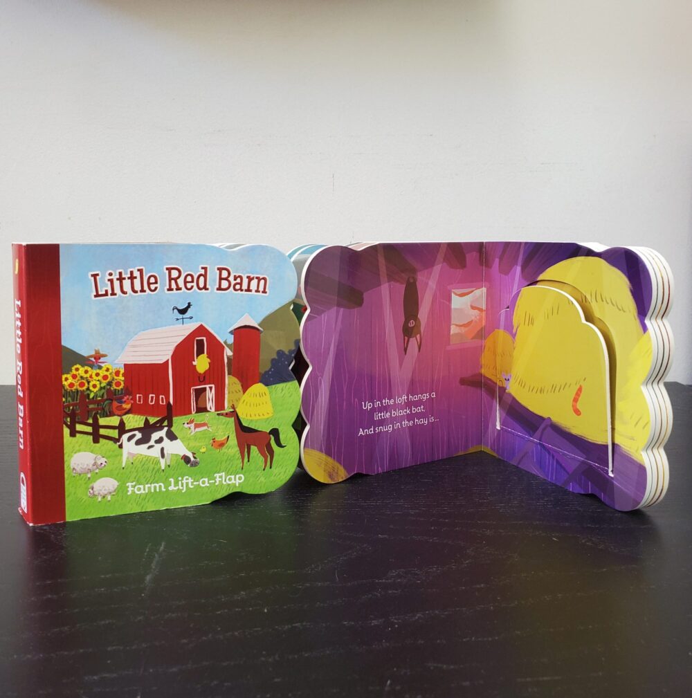 Learn about many different farm animals in a little red barn in this lift-a-flap board book.